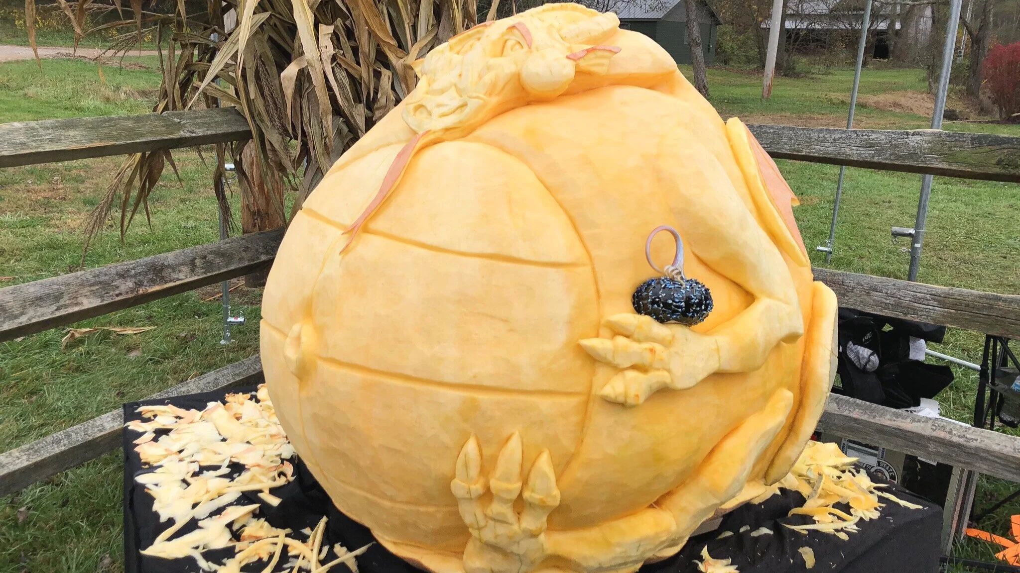A giant pumpkin typically takes about four to six hours to sculpt but you can watch it in two minutes.