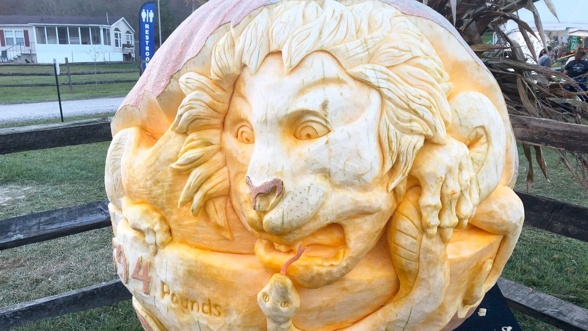 Food artist Gus Smithhisler carves the ‘Lion and Serpent’ on a 694-pound giant pumpkin. Located at Jack Pine Studio in the Hocking Hills area.